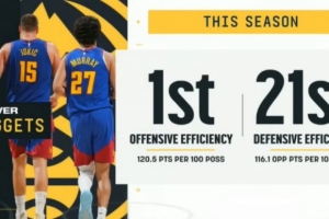 据统计,本赛季至今,掘金百回合进攻效率为120.5,排名联盟第一;