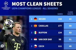 体育资讯4月8日讯 拜仁在本轮欧冠焦点战客场2-1力克皇马,40岁诺伊尔表现抢眼,完成多次精彩扑救。数据统计显示,他仍是欧冠零封次数最多的门将。